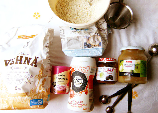 Sekoitin ensin kuivat aineet. Tässä vaiheessa voi halutessaan lisätä 1 tl vaniljasokeriakin.