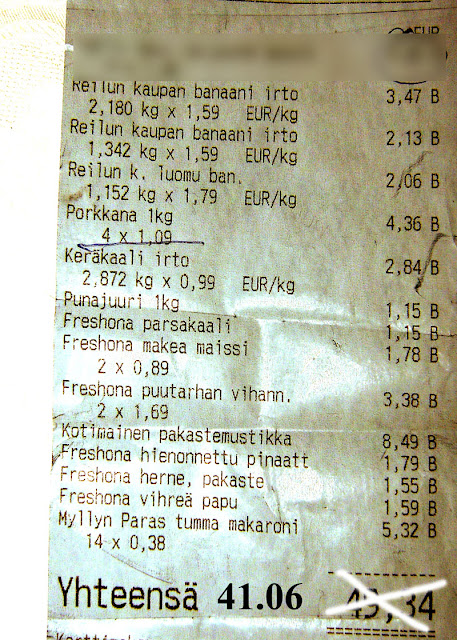 Tästä kuitista unohdinkin vähentää ennen laskuja, joten nyt sain ruokamenoiksi 124,9.
