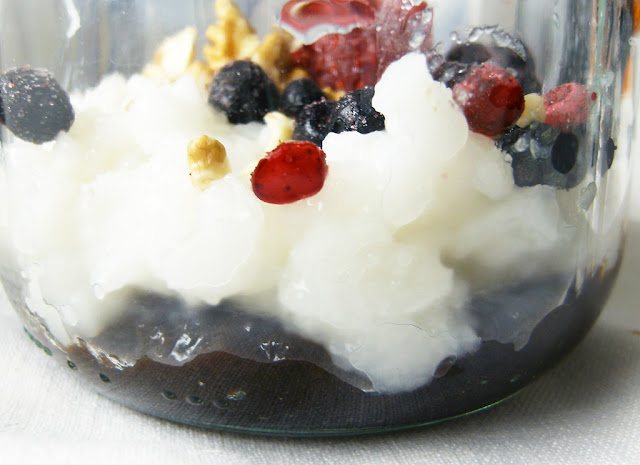 Seuraava kokeilu oli luumumarmeladia pohjalle, sen päälle kerros vaniljanmakuista kylmää riisipuuroa, ja sen päälle taas soijavaniljajogurttia. Marjoja ja pähkinää koristeeksi.Tämä oli perushyvä.